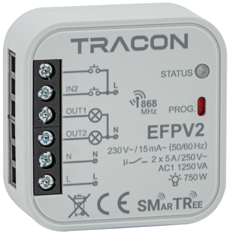 Műszaki adatok 230 V, 50 Hz, 2×5 A, 2 NO, 868.32 MHz